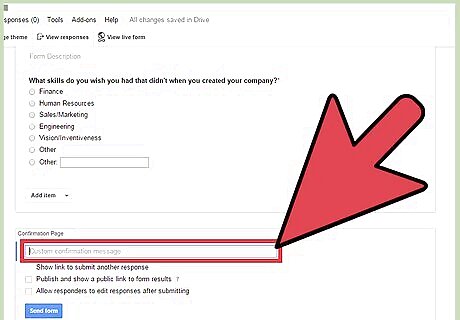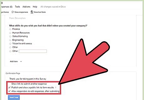 Adjust the confirmation page settings. There are a few other options to control your confirmation settings. Tick the ones you’d like to apply. “Show link to submit another response”—Tick this option to show the respondents a link to respond to the survey again. “Publish and show a public link to form results”—Tick this option to show the respondents the link to the survey results. “Allow responders to edit responses after submitting”—Tick this option if you allow your respondents to edit their responses after submission.