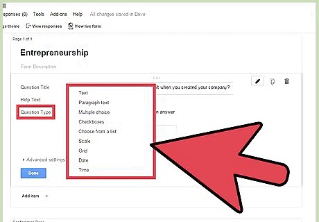 Select the "Question Type". Indicate what type of answer is acceptable for the question. Click the drop-down list to see the options. You can set it to Text, Multiple Choice, Checkboxes, Scale, and others.
