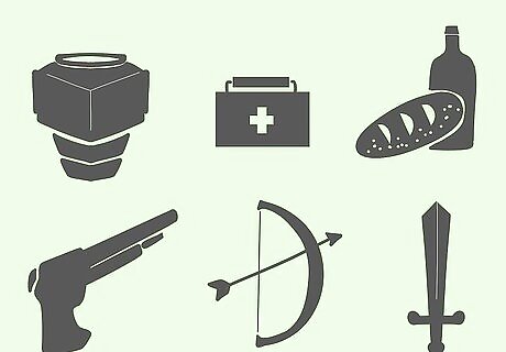 Understand the role of the Cornucopia. While players are moving around the board, they're trying to get to the Cornucopia, as it gives you items to help you in the game. When you get to Cornucopia, roll the dice to indicate what item you'll collect. The Director will then check this item off on your Cornucopia tracking sheet. Note that you can only get each item from the Cornucopia once, so if you roll a 1 for example, and you already have the item corresponding to it, you get nothing. None of the items from the Cornucopia expire, so they can be used multiple times throughout the game. Items in the Cornucopia are: 1: Armor - gives you the ability to block any heart and chest hits. If your opponent rolls a 5 (Chest) or a 6 (Heart), no damage will be counted against you. 2: Medical Kit - gives you the ability to lessen the severity of any damage against you by -1. For example, if your opponent attacks you and rolls a 5 for damage (Chest), a medical kit lessens this severity by -1, so the damage is actually a 4 (Shoulder). 3: Food & Water - gives you ability to move 1 extra space after each roll. 4: Gun - gives you the ability to increase the severity of any damage against your opponent by +1. For example, if you attack your opponent and roll a 5 for damage (Chest), arrows increase this severity by +1, so the damage is actually a 6 (Heart). 5: Arrows - gives you the ability to make 2 hits per attack. For example, if you roll a 3 (Arm), your opponent will get hit 2 times in the arm rather than once. 6: Sword - gives you the ability to counterattack. If you have a sword, you can attack your opponent immediately after they attack you.