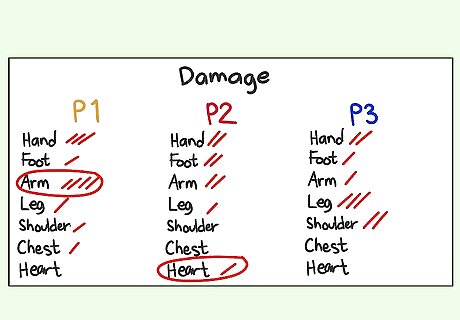 Keep track of the damage each player gets. At the beginning of the game, nominate one player as the Director. This person will keep track of damage as well as Cornucopia items on the tracking sheets as explained above, and let players know when they have been hit enough times to die. Note that some damages are more severe than others, so players need to be hit in that place a different amount of times before they die: 1: Hand/Foot - 4 hits = death 2: Leg - 4 hits = death 3: Arm - 4 hits = death 4: Shoulder - 3 hits = death 5: Chest - 2 hits = death 6: Heart - 1 hit = death