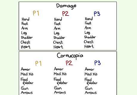 Prepare your Damage and Cornucopia tracking sheets. During the game, players will be receiving damage from attacks and receiving objects from the Cornucopia. Before the game starts, you'll want to make a chart to track both the damage and the Cornucopia objects: Damage: Write the name of each player down, then write down all the potential damages each player could suffer (these are listed below). When a player is hit, indicate with a check mark where the damage occurred. Note that each successful attack only counts for 1 hit. It's essential to keep track of damage, as this will indicate when a player is dead and out of the game. Cornucopia: Players will also be receiving different objects from the Cornucopia that will give them advantages during the game (these are also listed below). Each player can only receive 1 of each type of item from the Cornucopia, so it's important to track which player has which objects. Below each player's Damage tracker, write down the name of each object in the Cornucopia. When a player receives an object, put a check mark beside the object's name.