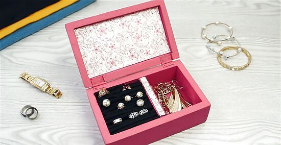 Store rings and pins in a felted box to keep them safe and organized. You can use any small box, such as an empty recipe box or a decorative wooden box from a hobby store. Measure the depth and width of your box, and then cut strips of felt that are the same width as the box. Starting from the longest edge, fold over a section of felt that’s the same height as the box. Flip the fabric over and then make another fold. Fold the entire strip like this so it looks like an accordion. Stitch or staple the ends of the felt together before gluing them into the bottom of the box with craft glue. Push your rings or pins between the felt folds so they stay in place. You don’t have to use folded felt for your entire box. For example, you could keep half of the box empty so you can store loose jewelry or other trinkets.