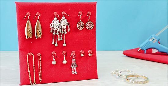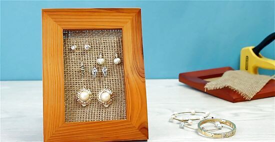 Add a touch of class to your decor with this framed earring holder. Take an old picture frame and trace the shape of it onto the piece of fabric you’re using. Cut out your piece of fabric with a pair of scissors so it’s the same size as the frame. Staple the fabric onto the back of the frame so it’s secure and flush with the edges. After you hang your frame on the wall, simply loop your earring hooks through the fabric so they stay in place. You can paint or add decor to the frame if you want to. Screw hooks into the bottom of the frame so you have a place to hang your bracelets and necklaces too. For a more rustic approach, try stapling chicken wire to the back of the frame instead of fabric.