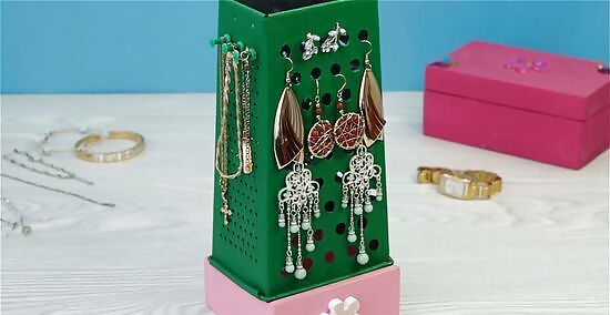 Revamp an old grater into a stylish earring holder. Clean off your old grater as much as you can and rough up the surface with any sandpaper. You can leave the grater as-is, or you can use an oil-based paint to give it an accent color that stands out in your room. If you paint the grater, wait for it to dry completely before using it. Just hook your earrings in the grater’s holes whenever you aren’t wearing them. Try screwing hooks into the holes on one side of the grater so you can hang up necklaces and bracelets as well. If you want to make the grater more decorative, then hot-glue pearl beads to the bottom corners after painting.