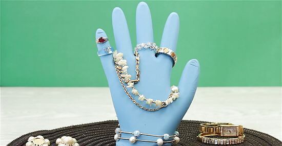 Slide your rings onto the fingers for a really decorative look. Cut the ends off of an empty plastic bottle and slide a glove over one side. Tape the wrist of the glove tight against the bottle and position it so the fingers point down. Mix plaster following the directions on the package and slowly pour it through the bottle into the glove. Let the plaster dry and harden completely before peeling off the glove. After it dries, display your rings on the fingers. You could also drape necklaces or bracelets between the fingers, but they could get tangled.