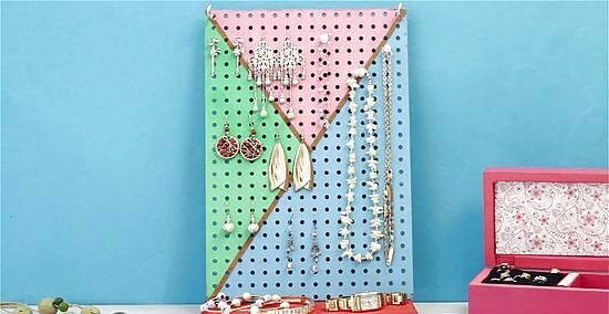 Pegboard makes it easy to add hooks for necklaces, bracelets, and earrings. You can leave your pegboard plain or paint it whatever color fits well in your space. Secure your piece of pegboard to your wall using nails or screws so it doesn’t come down. Slide some hooks through the holes at the top of the pegboard so you have spots for your long necklaces and bracelets. If you have earrings, just hook them through the holes as is. You can also get shelf-holders that fit in pegboard holes so you can set your rings or other decorations on a shelf.