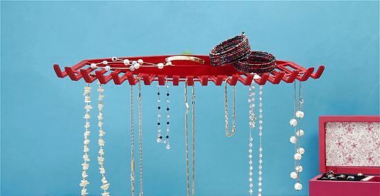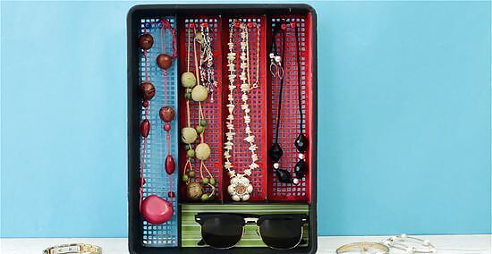 Bracelets and necklaces easily fit on the tines of this rustic alternative. Use a garden rake with a metal head that has straight tines so your jewelry doesn’t slide off. Cut the handle off of the rake with a saw. Secure the rake against your wall with nails or screws so the tines point straight out. Then, just slide your jewelry onto the tines. The rake tines could be sharp, so be careful when you’re hanging or grabbing your jewelry.