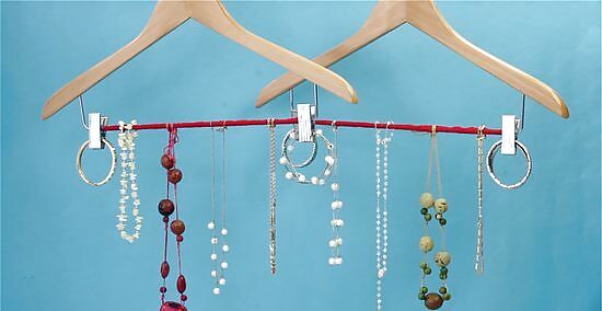 Loop your necklaces and bracelets on the hanger rod for a simple solution. Use a wooden hanger with a rod since it’ll look better than a plain wire hanger. Use a screwdriver to attach screw-in hooks or pegs along the length of the hanger rod so you can easily hang your jewelry. If you don’t have hooks, just clasp your necklace or bracelet around the rod so it goes through the middle. Paint or wrap the hanger in fabric if you want to customize it even more.