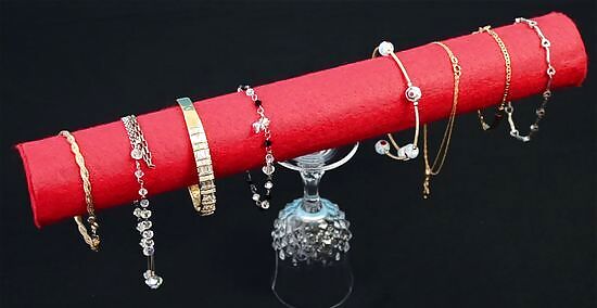 Hang your necklaces and bracelets around tubes so they don’t tangle. Use an empty paper towel roll so you have more hanging space, but you can use a toilet paper tube for a shorter holder. Paint or glue a piece of fabric or vinyl around the roll so the cardboard doesn’t show through. Hot-glue the roll horizontally to a candlestick or the top of a vertical tube so there’s room for your necklaces and bracelets to hang down. Then, drape your jewelry over the ends of the roll. Decorate your jewelry holder with some faux flowers to make it look more elegant. Cardboard tubes also work really well for storing watches.