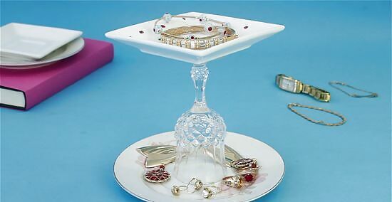 Set rings, earrings, and bracelets here so they’re easy to grab and go. Get 2 plates of any size and a short candlestick holder. If you want to, use paint pens to draw designs on the plate to make them pop a little more. Once the paint dries, use super glue to attach the base of the candlestick holder to the center of 1 plate. Then, add glue to the top of the candlestick holder and press the bottom of the second plate on top. Set a heavy book on top of the plate until the glue dries. If you use 2 different-sized plates, use the larger plate on the bottom so it’s more balanced.