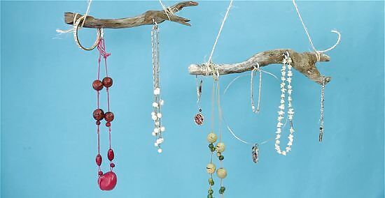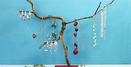 Try this for a simple, natural way to store your necklaces and bracelets. You can find your own piece of driftwood or buy a piece you like from your local craft store. Rather than using hooks or pegs to display your jewelry, hot-glue some decorative stones along the length of your driftwood. Wrap pieces of twine around the ends of the driftwood. Secure the other ends of the twine to your wall with screws or nails so your jewelry holder hangs level. You can also try hanging a tree branch on your wall so you have more places to hang your jewelry. Keep the branch pointed up or at an angle so your jewelry doesn’t slip off.