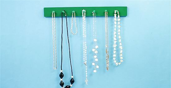 Paint stir sticks with hooks prevent necklaces and bracelets from tangling. Cut off the curved section of your stir stick as well as 2 pieces that are 1 in (2.5 cm) long. Glue the end pieces you just cut on the back of the stir stick so they’re flush with the ends. Pre-drill holes through the ends of the stir stick so it’s easier to attach later. Then, paint the stick whatever color you want to match your decor. Add hooks or pegs along the length of the stick, and position it horizontally level against your wall before screwing it in. Attach multiple stir sticks to your wall end to end to display a long line of jewelry.