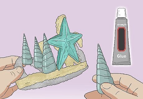 Add some spikes along the sides. Pick out your pointy shells, and glue then along the edges of your crown. Make sure that the opening of the shell is facing the tiara's band; this way, the hole won't be visible in the end. For a more interesting effect, glue the taller shells towards the center of the tiara, and the shorter ones towards the ends. You can add as many spikes as you want. You can have them go from the focal point all the way to the combs, or you can have just a few on each side. For a more interesting look, alternate between turret and conch shells.