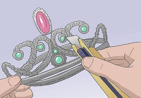 Remove any embellishments on the tiara. If the tiara has any clunky rhinestones or fuzzy boas, you will need to remove those first. If the tiara has any protruding pieces that you feel will interfere with your final design, cut them off with a craft blade; you can also try carefully breaking them off instead. If you have a metal tiara, you can try cutting parts off with wire cutters. If you really like a certain embellishment, save it so that you can glue it on later.