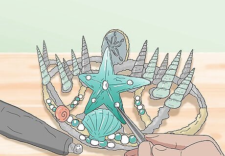Glue down the focal shell. Choose a large, scalloped shell, starfish, or sand dollar as your focal point. Glue it down in the center of the crown with hot glue or industrial strength glue.