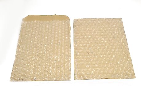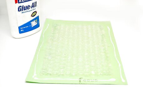 Glue the bubble wrap to the grocery bag. Lay the grocery bag cuttings flat on the table. Cover them with an adhesive such as rubber cement. Do not put glue on the flap of the bigger cutting. Lay a piece of bubble wrap on each cutting and allow the glue to dry.
