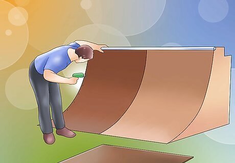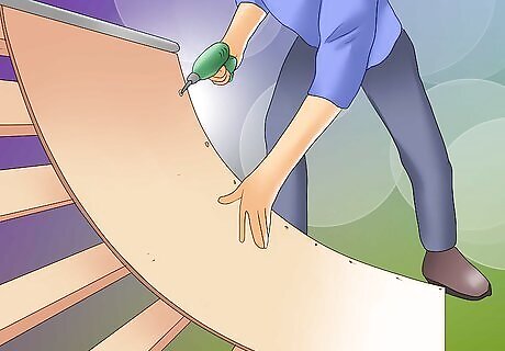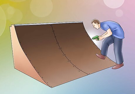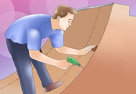 Start at the top and the far left of the quarter pipe frame that you have built and screw a 4-foot by 8-foot (1200 by 2400 mm) sheet of 3/8-inch (9 mm) plywood onto each of the 2x4 (50x100 mm) pieces of lumber as you work your way towards the bottom of the pipe.
