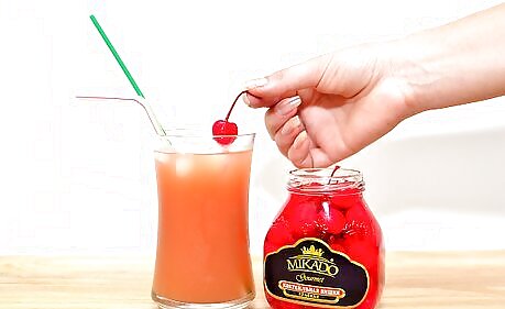 Plop the cherry in the glass and serve with a straw.