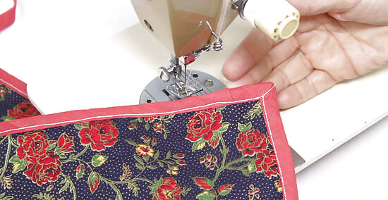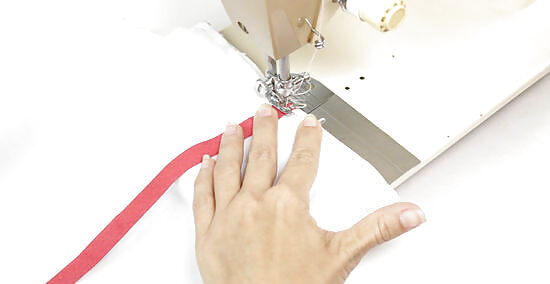 Sew the bias tape to the cover, hemming the end by 1 in (2.5 cm). Begin sewing at 1 end of the bias tape, without hemming it. Work your way around the cover. As you get close to the other end of the bias tape, fold the end under the rest of the bias tape by 1 in (2.5 cm), then finish sewing it. Topstitching is the same as a straight stitch. Sew about ⁄8 in (0.32 cm) from the inside edge of the tape, where the cover starts. Remember to backstitch when you start and finish sewing!