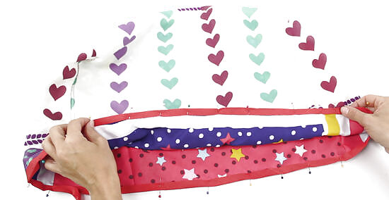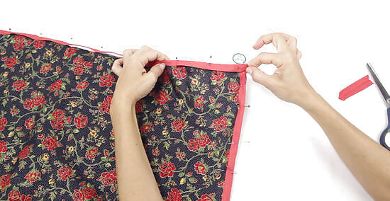 Pin bias tape around the bottom, raw edge of your cover. Measure all around the bottom edge of the cover, add 2 in (5.1 cm), then cut your desired bias tape accordingly. Fold your bias tape over the bottom, raw edge of your cover, then pin it in place. If you used pins to hold the bottom edge of the cover together, be sure to remove these as you add the bias tape. Choose bias tape in a color that contrasts or coordinates with the outside of the fabric. The width of the bias tape can be whatever you want, but something around ⁄4 to ⁄2 in (0.64 to 1.27 cm) would be good.