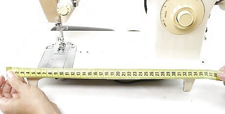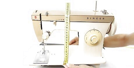 Wrap a measuring tape over the top of your sewing machine. Hold the end of a measuring tape against the front of your sewing machine, right at the base. Pull the rest of the tape across the top of the machine and back down to the other side. Hold the tape against the base and record the measurement. Start and finish your measuring at the long side of the sewing machine's base, not the short. This will be the “height” measurement for your pattern.