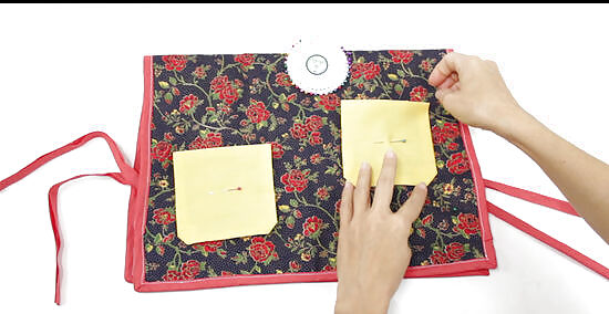 Hem the pockets by ⁄2 in (1.3 cm) if you made them. Turn the pockets over so that the back side of the fabric is facing you. Fold the side edges down by ⁄2 in (1.3 cm), then press them with a hot iron. Next, fold the top and bottom edges down by ⁄2 in (1.3 cm), then press them with a hot iron as well. For a nicer finish, fold and press the corners by ⁄2 in (1.3 cm) first, before you fold and press the side, top, and bottom edges. This will give you seamless edges. Use a heat-setting on the iron that's suitable for the fabric that you are working with. Most irons come labeled with the fabric type.