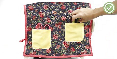 Place the cover on top of the sewing machine, then tie the ribbons. Pull the first set of ribbons away from the lining, and then tie them in front of the sewing machine. Pull the next set of ribbons away from the lining as well, and tie them in the back of the sewing machine. The front of the sewing machine is the end with the needle. The back is the end with the wheel and thread spool. Tie the ribbons into bows, not double-knots. Not only will they look nicer, but they'll be easier to untie. If you added pockets, feel free to stash extra items in them, such as manuals or scissors.
