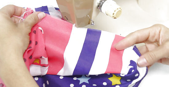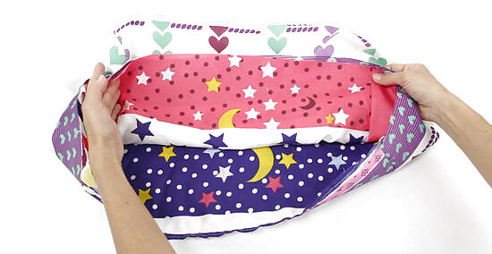 Sew the side panels to the main panel with the front sides facing in. Wrap the side edges of the main panel around the side, top, and side edges of each side panel. Pin the panels in place, with the front sides facing in, then sew them using a straight stitch and a ⁄2 in (1.3 cm) seam allowance. The front side is the same as the "right side" using traditional sewing terms. Be sure to backstitch when you start and finish sewing each side panel. This is where you reverse the sewing machine for a couple of stitches.