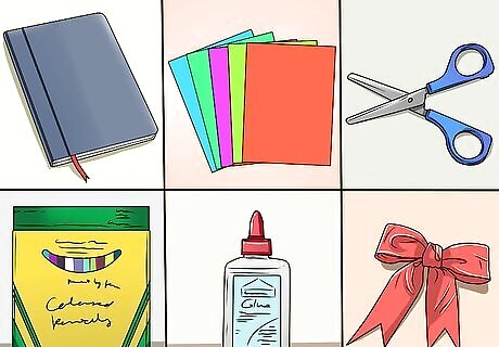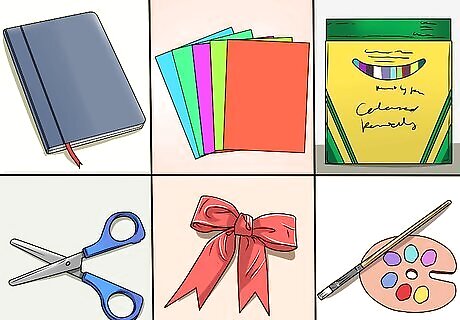 Round up your decorating supplies. Some of these supplies you will need for decorating the cover as well as the pages. Scrapbook paper Colored card stock or paper Pens Scissors Paint and paint brushes Markers or colored pencils Glue, a glue stick, or double-sided tape Decorative tape Fabric and fabric glue Ribbon Sequins Stickers Magazines or newspapers Stamps Pockets or envelopes Wrapping paper