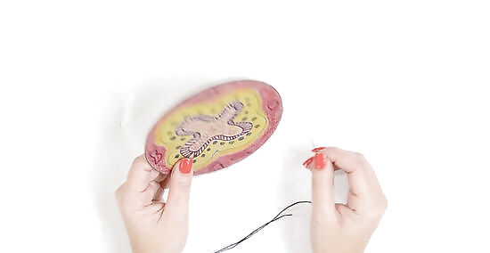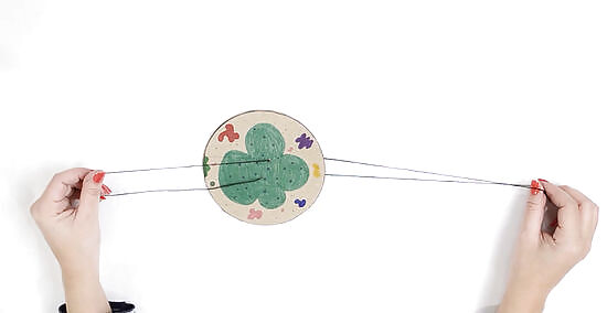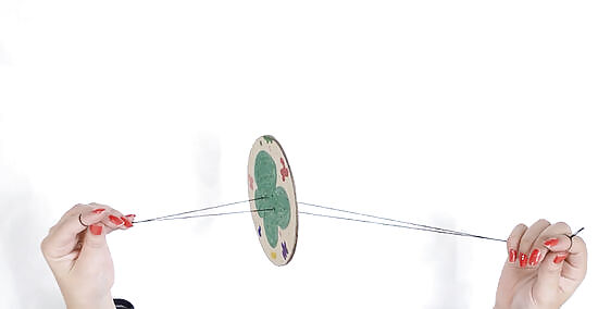 Pull your hands apart to unwind the twirly whirly. Pull your hands apart slowly, and at the same time. As you pull them apart, the string will begin to unwind, causing the disk to spin! Your hands will move closer together as the string winds up, and further apart as it unwinds. Experiment with bringing your hands closer and further apart. This will cause the disk to spin faster or slower.