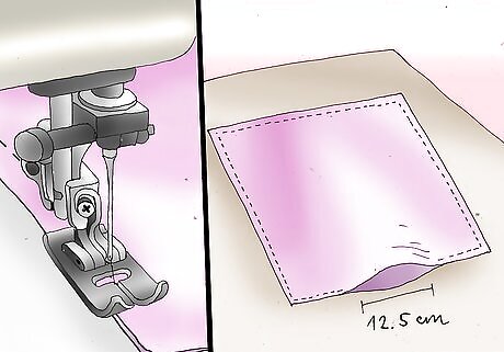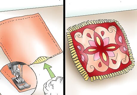 Stitch along the 4 edges of the fabric, .5 inch (1.27 cm) from the edge. Leave a 5-inch (12.7 cm) gap so you can stuff the pillow. Clip the corners of the throw pillow, then turn it right-side out. Stuff the decorative throw pillow with the batting, and hand sew the gap closed.