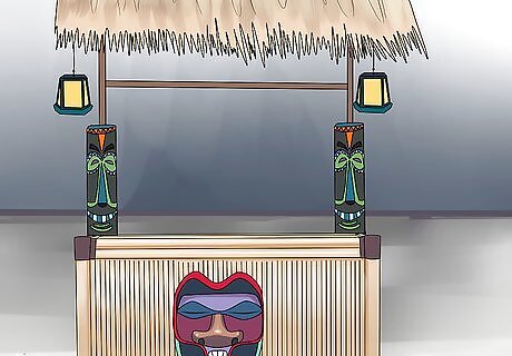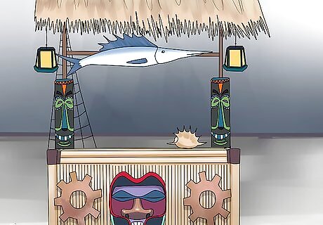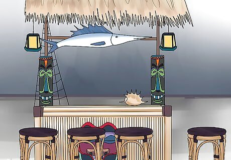 Throw up some fishing gear, like nets, shells, mounted fish, etc. Tiki bars are supposed to be on the beach, so give people a beachy atmosphere to enjoy. Fishing nets can be tacked to walls or posts, shells glued to the back wall or scattered on the bar, and a big, mounted marlin or other salt-water fish proudly displayed nearby. Old, woven rope is a cheap and easy way to add some ambiance as well. Try wrapping it around the bottom of posts or use it to hide the joints in your construction.