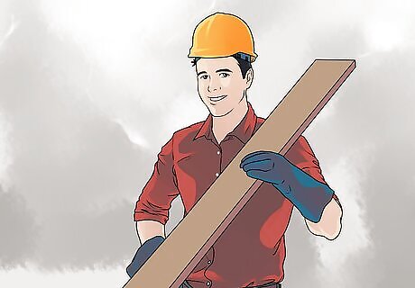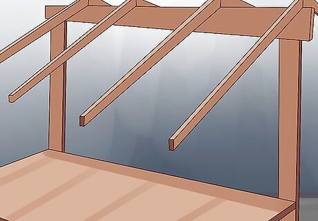 Cut a right angle notch in seven 2x4x9 boards and use them to form rafters. These boards make the frame for the roof. Lay a board on its side between the front and back frames -- it should naturally slope down. Mark the point where the board hits the lower beam (the front wall) and then cut out a small notch so that the board snaps into place on the front wall. For a really professional look, cut diagonally from this notch to the shorter end of the plank so that, when attached, the bottom of the rafter is parallel to the ground.