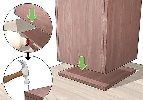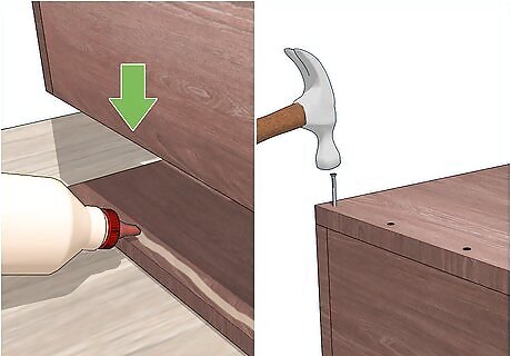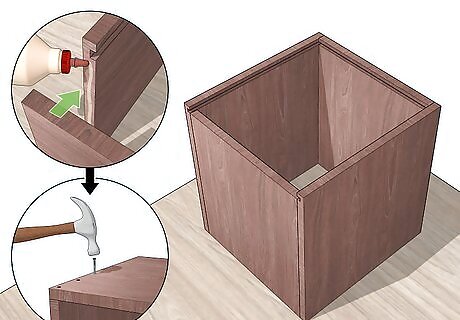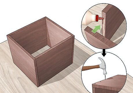 Attach the sides to the base. Make sure the sides sit evenly on the base or are snug around the base, depending on your design. Use glue to attach the base and sides. Hammer or drill in finishing nails, wood screws, or dowels. Allow your box to dry thoroughly before sealing or using it.