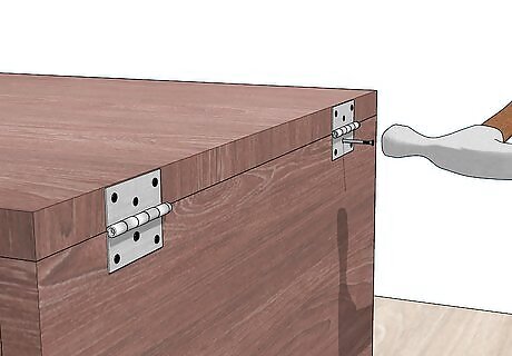 Attach a hinged lid to the box. Set the lid on the box so the lid and side are flush, then measure and mark where you'd like your hinges to be. Keep the hinge knuckle facing out from the back of your box and drill or hammer to attach it to the side and then the lid. When laying out the hinges, it is important that you square them to the top and to the sides of the case. Otherwise, the door will not close or open correctly. It's helpful to clamp the side and lid together when measuring and installing the hinges.