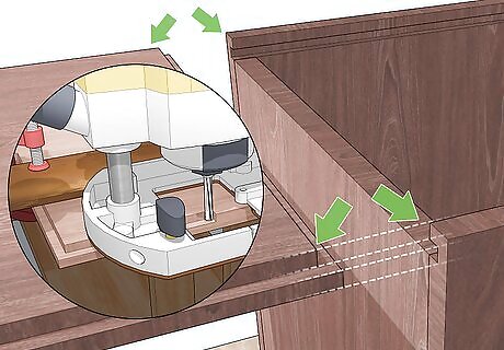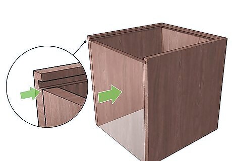 Assemble the side pieces using a butt joint. Make sure the grooves are facing inward. Join the sides together at a right angle using glue between the joints for durability. At this point, it should look like a square with no base or lid attached yet. Next, hammer or drill in finishing nails, wood screws or dowels. You may want to use clamps to hold the glued sides together while you drill nails or screws into them. If you're using dowels, drill a hole through the side of one piece into the side of another. Use a wooden dowel to pin the pieces together in an "L" shape. After the sides are pinned, cut the dowel flush with the sides.
