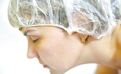 Tuck your hair under a shower cap. If you have very long hair, consider pulling it up into a loose bun and clipping it in place first.
