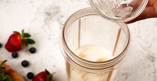Put the bananas, ice, and milk into the blender. The ice cubes will help make your smoothie thicker. If you are using frozen bananas, you do not need to add the ice cubes.