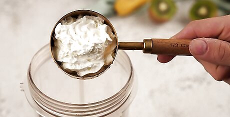 Add 2 to 3 scoops of vanilla ice cream. You can add all of the ice cream into the blender now, or save the last scoop to use as a topping later.
