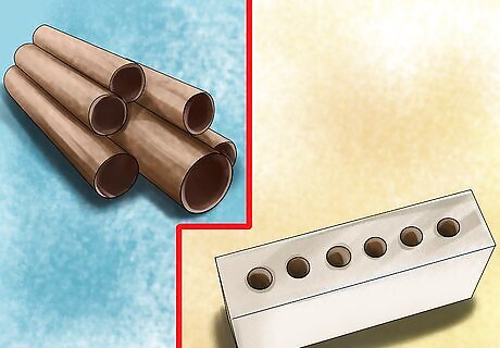 Create holes. Many different types of bugs like to have crevices to hide in. It's a good idea to have at least one section of your insect hotel full of holes. Put hollowed-out plants stems into a drain pipe. Then, place that drain pipe into a section of the insect hotel to make an excellent shelter for bees. You can also pack one section of the hotel full of rows of rolled-up papers. Try to make holes of various diameters so they'll cater to many different insects. Try drilling smaller holes into a piece of wood, then set the wood into one corner of your hotel. Small holes may be better for smaller insects.