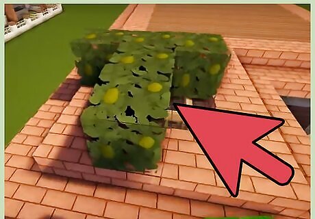 Add vegetation. This might be the simplest step of this guide, seeing as all you have to do is add greenery to your villa. Place vines all over the sides of the walls. You don't need to place all the vines individually, since it naturally “creeps” down the walls after a while. Just place a couple on the highest part of your wall then wait for it to grow. Placing flowers and ferns on the ground along the walls can really improve the scenery as well. You can plant trees nearby, preferably the likes of Spruce and Birch. You can also make trees by placing a stack of Fence Posts about 2–3 blocks high, then placing some leaves around it to form a tree. Bushes can easily be made by placing a block of wood or wooden planks, then covering it with leaves. You can also place two Fence Posts about 1 block apart then place leaves in between to create a sort of neatly-cut topiary design. You can also place your plants in Flowerpots, both inside the villa and out! Flowerpots are crafted by placing 3 Bricks in a V-shape in your crafting table's grid. Once crafted, you can place nearly every type of "small" flora (like posies, dandelions, tulips, and mushrooms but not "big" ones like tall grass, ferns, rose bushes or sunflowers) in it, no matter what special conditions it has for planting. Do note that anything planted in a Flowerpot can't be bred or farmed!