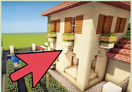 Build arching pillars. Aside from the open design, Italian villas often have arching pillars incorporated in the design, especially for the patios, roofed balconies, and such. While tricky with such a blocky medium, it's doable with a pair of stairs and slabs. Take some blocks of your chosen material (you can use the same material as you built the walls with, stone or wood), and place them about 2–3 blocks apart to act as your pillar's support. Now, take any material you want for the arches, and simply place them on the sides of your arch's support block, with the steps of the stairs facing downwards. If you chose to place it 3 blocks apart, place a slab in between the two stairs. And there's your arch! You can use them for your entryway, the patio, or as walls to your garden! a = arch block s = stair sl = slab d = door a s sl s a a X X X a a X X X a or a s s a a X X a a X X a To make an arch for a single door, follow the three-block-gap pattern then place the doors behind the arch, on the wall. There aren't many feasible ways to create a single door arch pattern you can emulate with the arch alone, since it leave strange gaps on the top or sides of the door. To make on double doors, use the two-block-gap pattern, then you can place the doors either between them or behind them. This works better than the one-gap arc patterns since there's ample room for the arc and the doors without sacrificing the pattern.