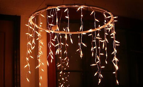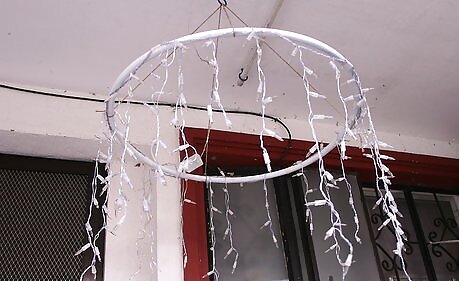 Join the tubing to the hula hoop, locating each tube well spaced around the perimeter of the hoop. You should essentially be creating a pyramid with the tube. Use duct tape to join the tube to the hoop and the three tubes together at the top. Optionally you can tie the twine forming a cross and hang it up on a hook.Make an Outdoor Chandelier with Icicle Christmas Lights Step 9Bullet2.jpg