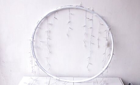 Lay icicles around the edge of the hula hoop. Essentially you are determining placement before you tape the icicles in place. Make sure the entire hoop is covered and icicles are draping downward off the hoop.