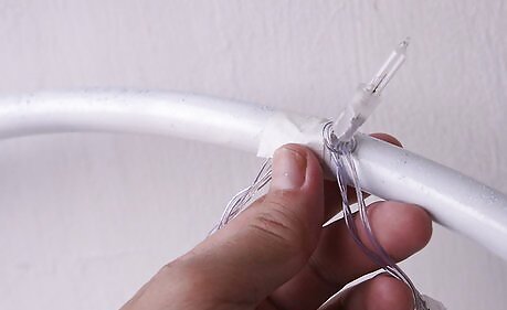 Tape icicle wire to the hula hoop. Wind tape around in a circular motion, covering the wire but not the lights. Smooth any bubbles or bumps along the way.