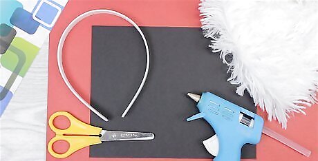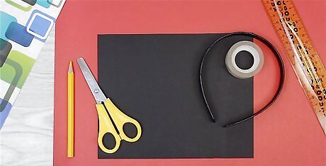 Gather your materials. For paper cat ears, you’ll only need clear scotch tape, construction paper (one piece is enough), a ruler, scissors, and a headband. You can use glue instead of tape if you don’t have clear tape. Use a headband that matches your hair color so that it blends in when you wear your costume.