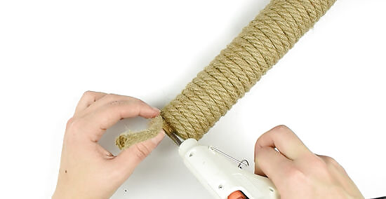Transform a cardboard poster tube into a simple, colorful scratching post. Use standard cream-colored sisal rope to wrap the tube, or pick some rope that is dyed your favorite color to make it aesthetically appealing. Then, wrap the long piece of rope around the poster tube until all of the cardboard is covered. Secure the ends of the rope to the tube with hot glue to keep it from unraveling. The amount of rope you need greatly depends on the size of your tube, so bring it with you when you purchase your rope to help you gauge the amount you need. Purchase the poster tube at your local post office, craft store, or online with major retailers. Pick up some sisal rope at your local craft or hardware store. Have the post lay down or make it vertical by creating a base out of a cardboard box. Simply fill a small cardboard box with weighted items like large rocks. Seal the box with packaging tape to keep it from opening. Use hot glue or long strips of packaging tape to vertically secure the tube to the box.