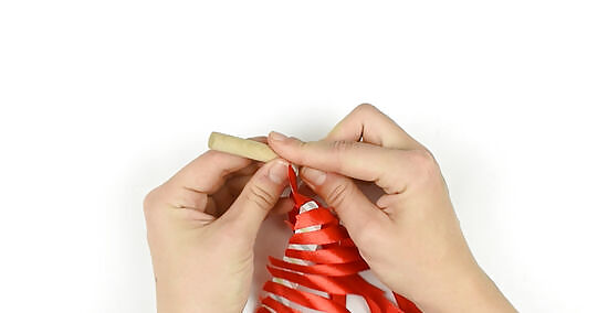 Tape a bundle of thin ribbons to a wooden dowel for a fun shaker. Gather 20-30 pieces of ribbon that are at least 6 in (15 cm) long and ⁄8–⁄4 in (0.32–0.64 cm) wide. Lay a 10 in (25 cm) piece of decorative tape on a flat surface, glue-side up, and stick the end of each ribbon across the long edge of the tape. Then, take 1 end of the tape and wrap it around the 1 end of a wooden dowel. Continue this process until all of the tape is wrapped around the end of the dowel so that the ribbon is gathered and hanging off the dowel. Have fun dangling it in front of your cat! If you do not have ribbon, cut pieces of paper or fabric from an old T-shirt into thin strips. Hot glue a small bell to the tip of the finished shaker to make it more stimulating for your cat to play with. If you do not have a wooden dowel, use an unsharpened wooden pencil instead.
