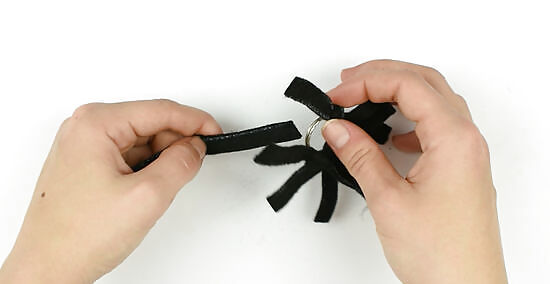 Tie strips of felt to a 1–2 in (2.5–5.1 cm) key ring to make a knotty spider. Cut a 5 by 5 in (13 by 13 cm) piece of felt into 12-14 strips of similar width. Use a double knot to tie 1 strip to a metal key ring. Repeat this process with the remaining felt strips until the entire circumference of the ring is covered. Then, have fun watching your cat to play with the knotty spider! If you do not have a metal key ring, you can also use the circular plastic ring found along the top of most sealable plastic bottles, like a milk container. Have fun using different pieces of colored felt to make the thin strips. Consider using red and green strips for a holiday-themed knotty spider, or a combination of your favorite colors.