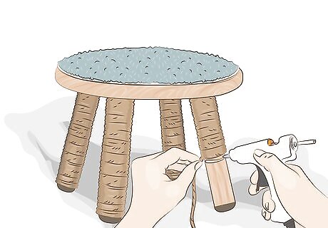 Wrap a wooden stool with rope to create a sturdy, long-lasting scratching post. Take an old wooden stool and purpose it by wrapping the legs with sisal rope. Secure the ends of the rope to the wood with some hot glue. Size and cut a piece of carpet to fit the top of the stool, and secure it with hot glue. Once the hot glue dries, your cat will have endless fun scratching away at the covered stool. If you do not have a wooden stool, visit your local thrift store and purchase an inexpensive one. Your local department store may even have a plastic one to use as an alternative.